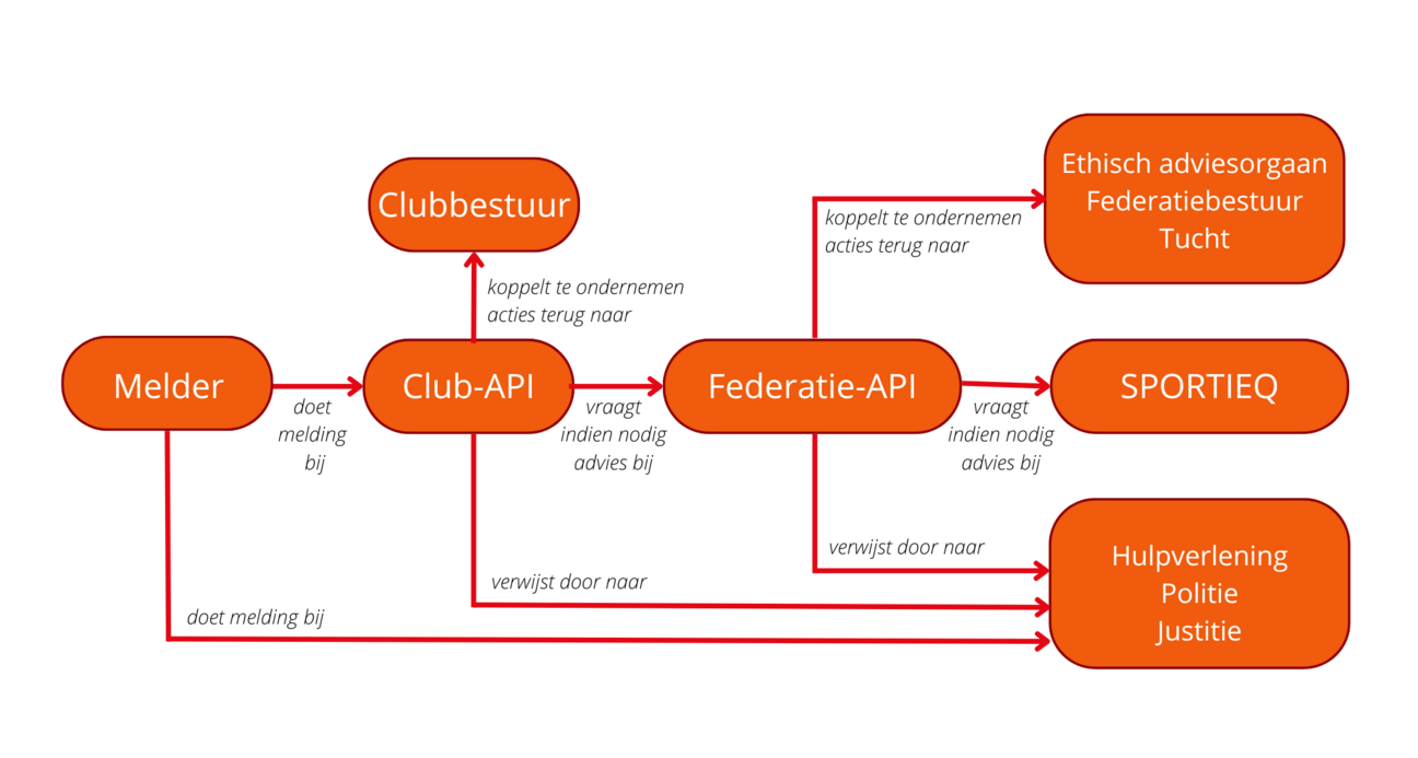 - Aanpak: De club-API neemt elke vraag of melding ernstig. De club-API – eventueel bijgestaan door een noodteam – volgt daarbij een logisch stappenplan (handelingsprotocol): de club-API vormt zich een beeld van de situatie, schat de ernst in, en verleent de melder vervolgens informatie en advies of verwijst door. Bij vermoedens of aanwijzingen van ernstig grensoverschrijdend gedrag (rood of zwart) is het niet de taak van de club-API om zelf hulp te verlenen of op onderzoek uit te gaan, maar verwijst hij door naar de federatie-API en/of deskundigen (hulpverlening, politie en justitie).